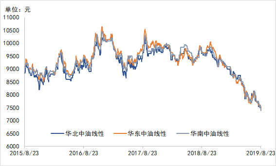 2019年可谓是自2015年以后PE产品最低迷的一年,国内的PE价格在年初的一波拉涨之后持续下行,经历了6月初一波破位下行之后,市场谨慎心态凸显,截止8月23日,期货跌至2015年以后最低点,现货市场也因供需基本面弱势,加之长时间持续阴跌导致的惯性心态看空,持货商持续让利出货。