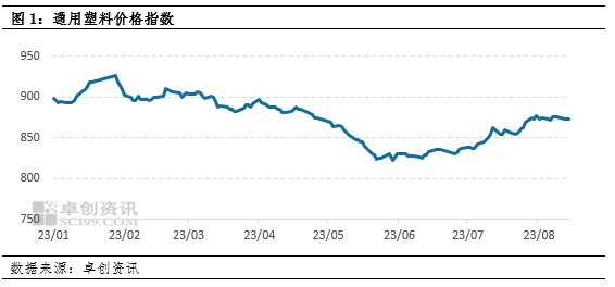 2023年8月至今(8月16日)塑料价格指数形成震荡走势,价格重心小幅下移,8月16日收于872.5,较月初下移0.78点,实际走势与《塑料价格指数初现彩虹,但难以维系》中预测结论一致。价格波动的原因在于国内需求恢复不及预期,然而塑料产量随着检修结束进一步走高,原油市场走势虽然跌宕起伏,但仍处于高位,对塑料市场产生支撑。
