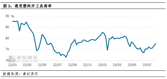 从行业角度来看,2023年7月我国塑料制品产量为651万吨,环比下滑2.25个百分点,在去年基数较低的情况下,累计同比增长0.5%,更微观角度来说,我国塑料下游综合开工负荷率有所下降,表明了我国塑料产品需求有所下移。