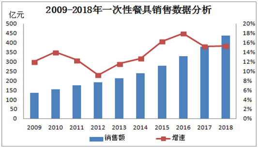 由上图2009-2018年一次性餐具数据分析发现,餐饮数据整体增幅可观,2018年一次性餐具销售规模约436亿元,同比2010年155亿元增幅181.29%,可见一次性餐饮市场规模发展速度极快。由于伴随国民消费水平提高及现在快节奏社会生活影响,一次性餐具消费规模呈现令人惊讶速度增长。