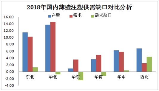 由薄壁注塑供需缺口数据对比分析发现,需求缺口集中在华北、华东及华南地区,而供需失衡地区多集中在西北及东北地区,两地多以货源调拨至各大区域以缓解当地供需失衡局势。华东地区供需缺口较为明显,但因华东地区受环保政策影响,在2018年4月27日当地政府出台餐盒使用标准,该标准推行后,外卖行业将采用生产技术较为成熟得淋膜纸碗替代塑料送餐盒,约可减少75%以上得塑料垃圾。由于该政策提出,华东地区整体薄壁供应量明显下降。